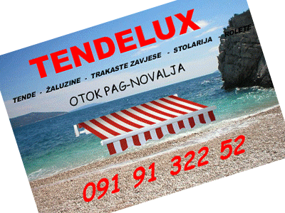 Proizvodnja i montaža svih vrsta tendi,stolarije,roleta, žaluzina,mrežica i trakastih zavjesa, na otoku Pagu sa sjedištem u Novalji. Veliki izbor designa, brza usluga izmjere,servis, sve na jednom mjestu i sve u Vašoj blizini, na otoku Pagu-Novalji. Tende su izrađene od vrhunskog materijala, u domeni zaštite od sunca, sa velikim izborom načina montaže, te tipova ugradnje na ručni pogon, sa motorom i daljinskim upravljačem, te senzorima za vjetar. Ako ste na otoku Pagu i želite se zaštiti od sunca, ako trebate ugraditi stolariju ili garažna vrata na vaš objekat, ako su vam potrebne rolete, venecijaneri, trakaste zavjese ili pak želite zaštitu od komaraca i insekata- tada je Tendelux pravi izbor i rješenje za Vas.